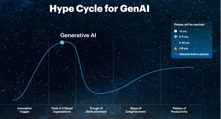 Para CIOS, la revolución de la AI generativa y de cómo los CIOD y las compañías deben diseñar una estrategia para afrontar esta revolución. A continuación muestro el Hype Cycle de Gen AI de Gartner que mostraron en el Gartner Symposium en Nov 2023.