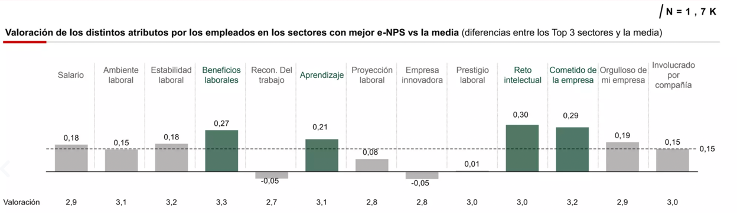 Los empleados no sólo se basan en temas salariales, pero no hay que olvidarlos. Viendo una de las gráficas que se desprende del informe vemos que es importante también los Beneficios Laborales, Aprendizaje, Reto intelectual y cometido de la empresa.